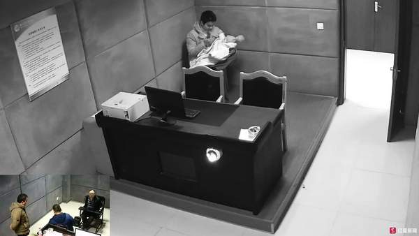 ▲民警化身“奶爸”照顾小孩,一旁的审讯室还在审讯嫌疑人