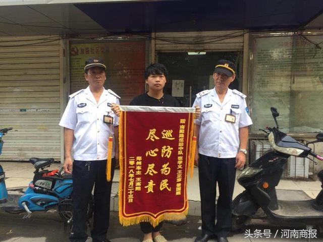 小王因为有事要回浙江,但为了感谢热心的巡防队员们,他特意让郑州的朋友做了一面锦旗来表示他的谢意。