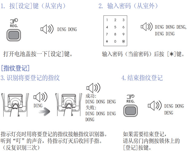 如果需要结束登记,请从房门内侧按锁体上的[登记]按键。听到提示音“ding dong deng”,那么恭喜您,指纹添加成功了。