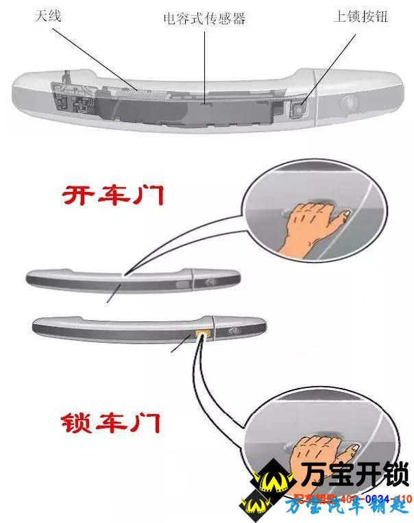 无钥匙进入系统的秘密在门把手上,它的天线、传感器和上锁按钮都位于车门外的把手内,只要携带已授权的无线遥控器就可以打开或关闭车门。它的内部有一个电容,当驾驶员手部靠近车门外把手时,车门外把手中传感器的电容发生变化,并把这个变化传递给控制单元,控制单元经过分析与判断认为驾驶员有上车的意愿,随后就指令车门锁动作,车门解锁;当驾驶员按下上锁按钮时,控制单元发出解除车辆联锁的指令,车门锁动作锁止车门。