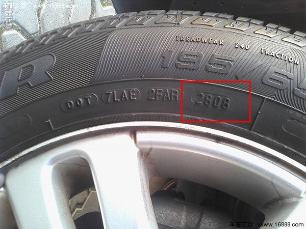 轮胎可以算得上是车上损耗最大的零部件了,基本上跑个5-8万公里,5年以内就得换,所以如何在购买二手车的时候发现超过5年胎龄一定要注意。轮胎的生产日期是比较容易看的,在这个椭圆形的小圈里有4个数字,后两个是年份,前两个是本年的第几周,上图所示就为2008年的第28周,也就是7月份左右,这样就可以很快推算出生产日期。